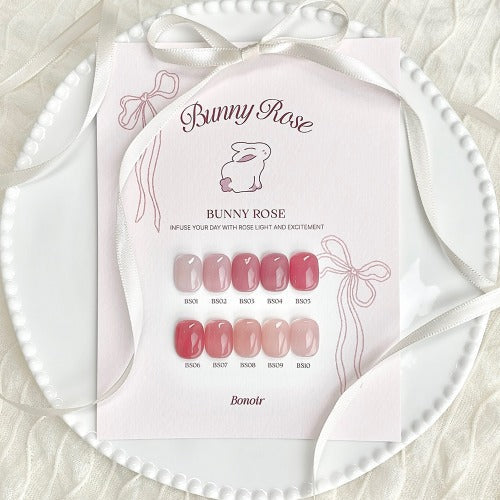 The Bonoir Bunny Rose Collection features 10 syrup gel colors inspired by soft blooming & dried roses and the pink hues of a bunny.