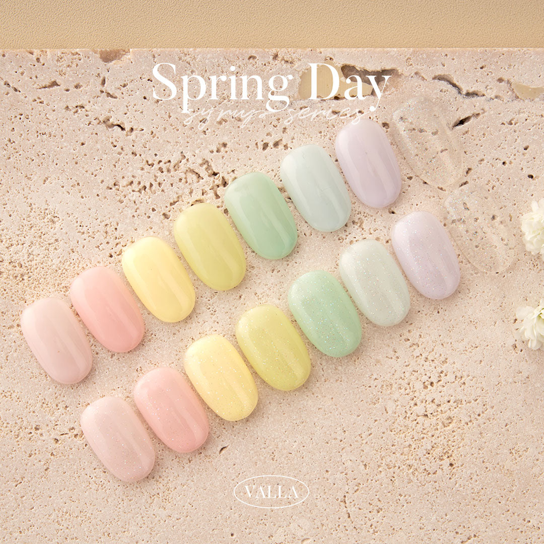 Valla's Spring Day Collection consists 7 cute syrup gels and 1 fine layering glitter gel that emulate the colours of a blissful spring day.