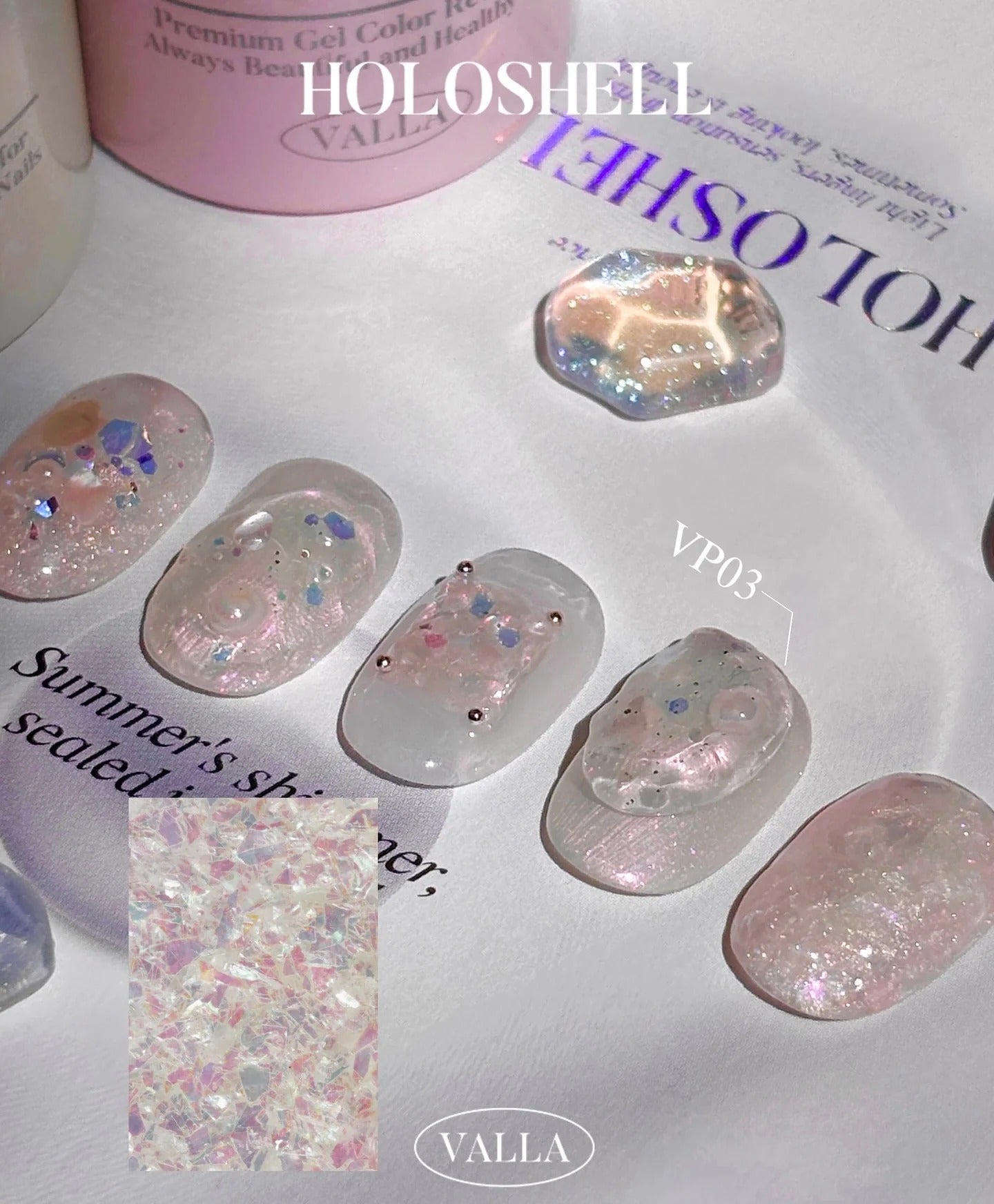 VP05-07 are non-wipe powder gels - syrup colour gels infused with aurora powder particles. After applying on the nail a bubble effect will be created. Perfect for layering.